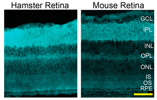 Filipin, a validated histochemistry agent for staining of cholesterol [52], was used. Cholesterol was found in every retinal layer, and its distribution in hamster retina was similar to that in mouse retina (Figure 9).
