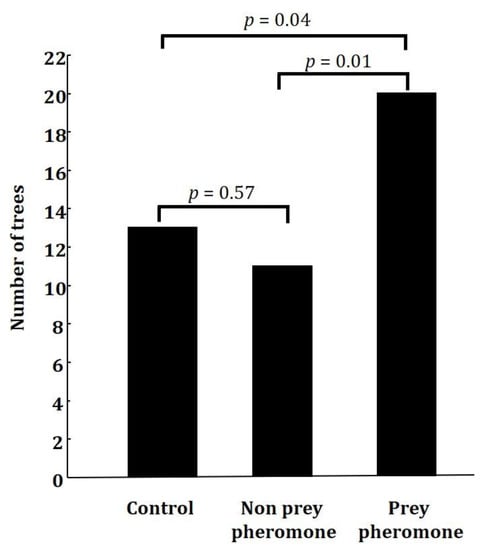 We modelled the probability that at least one predation event would occur in a tree in relation to the treatment (prey pheromone vs. non-prey pheromone vs. control) with a generalized linear model (GLM) fit using the Laplace approximation with binomial errors and a logit link function. We also analyzed the probability that at least one event would occur per visit in relation to treatment with a generalized linear model (GLM) fit using the Laplace approximation with binomial errors and a logit link function. Data analyses were performed with the statistical program R 4.0 stats package [].