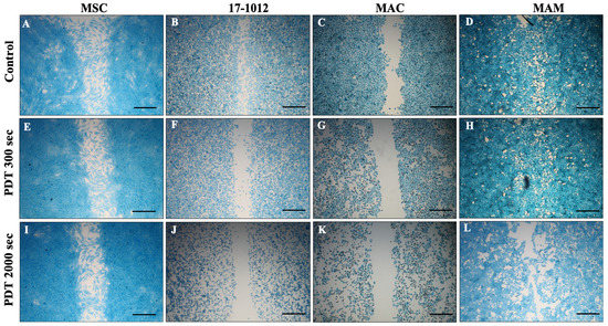 The MSC-control group showed no effect after 5-ALA PDT irradiation (Figure 1A,E,I; Suppl. Figure S1A,B). In contrast, the MAC (Figure 1C,G,K; Figure 2) and 17-1012 (Figure 1B,F,J; Figure 2) cells showed a decreasing tendency with respect to migration potential after sensitizing with 5-ALA (1.5 mM) and 300 s, respectively, and 2000 s light exposure when compared with the non-irradiated breast cancer cells. This effect was not observed in bone metastases of renal carcinoma (MAM), which did not show notable changes neither in cell migration nor cell morphology after 5-ALA and additional irradiation with blue light (Figure 1D,H,L; Suppl. Figure S1G,H). A minor decrease in cell migration was observed after longer (2000 s) PDT exposure (Figure 1L; Figure 2), and a similar tendency was observed for the PDT sensitizing with 5-ALA at a concentration of 1 mM (Suppl. Figure S2).