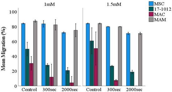 Semi-quantitative assessment of cellular migration potential following PDT exposure. The rate of cell migration for all cell lines (17-1012—giant cell tumor of bone, MAC—bone metastases of invasive ductal breast carcinoma, MAM—bone metastases of renal cell carcinoma and MSC) was measured as a distance (μm, using the open-source software ImageJ) 24 h post light exposure. As a photosensitizer, 5-ALA was employed at two different concentrations: 1 mM (left side) and 1.5 mM (right side). Values represent means ± SEM; n = 3 independent experiments. Abbreviations: 5-ALA—5-aminolaevulinic acid, sec—seconds.