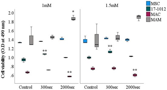 To investigate the effect on cellular viability after PDT exposure with 5-ALA, an MTS assay was conducted on all cell lines. Independent of the exposure time, for both of the employed 5-ALA concentrations (1 mM and 1.5 mM) a similar and comparable tendency for all of the cell lines was observed (Figure 3). A statistically significant decrease in viability was observed for the MAC cell line at both 5-ALA concentrations: 1 mM (p = 0.009) and 1.5 mM (p = 0.002) at a 2000 s exposure time when compared with their corresponding controls. Contrastingly, the 17-1012 cell line exhibited an increase in viability (p = 0.007, both 5-ALA concentrations) at an exposure of 300 s, followed by a decrease at 2000 s of exposure time (p = 0.257). The MAM cell line showed an increasing tendency in viability for both exposure times and 5-ALA concentrations (p = 0.022, 1 mM, 2000 s, respectively, p = 0.056, 1.5 mM, 2000 s). Irrespective of the exposure time and photosensitizer concentration, the number of viable MSCs remained unaltered and no notable change was observed.