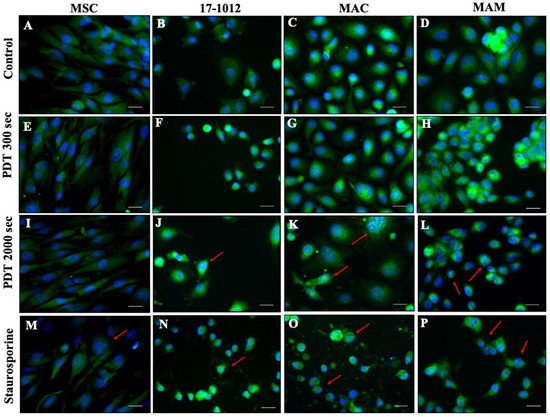 Changes in nuclear morphology as a hallmark for apoptosis were also examined qualitatively utilizing fluorescence microscopy. DAPI and cytosolic staining were used to visualize the changes in the nucleus and formation of apoptotic bodies—important hallmarks of apoptosis. It could be noted that after 2000 s of PDT exposure with 1.5 mM of 5-ALA, MAC, MAM, and 17-1012 cell lines (Figure 4 and Supp. Figure S3 for 1 mM 5-ALA) showed apoptotic features at various extents, such as nuclear shrinkage (red arrows, Figure 4). Nuclear fragmentation was particularly notable in the MAC cell line (Figure 4K). It has to be noted that this distinct morphological feature—characteristic for apoptosis—was not a generalized feature for the entire cell population. The MSC-control group showed no effect after 5-ALA PDT irradiation (Figure 4A,E,I,M).