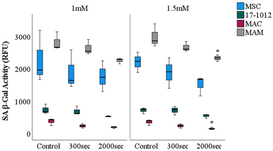 Cellular senescence or cellular aging is characterized by a diminished replicative capacity coupled with altered functionality within the cell [30]. To clarify and elucidate the cause of the observed changes in cellular vitality and nuclear fragmentation after PDT exposure, all cell lines before and post PDT were sequentially evaluated in terms of cellular arrest (SA β-Gal activity). For both of the employed 5-ALA concentrations (1 mM and 1.5 mM) a similar and comparable decreasing tendency in SA β-Gal activity was noted for all of the cell lines (Figure 5). More so, all cell lines were characterized by a decrease of SA β-Gal activity with increasing exposure time. Overall, a higher fluorescence intensity signal representative for β-Gal activity was noted for the MAM cell line as well as the control group, MSC, when compared with the MAC and 17-1012 cell lines.
