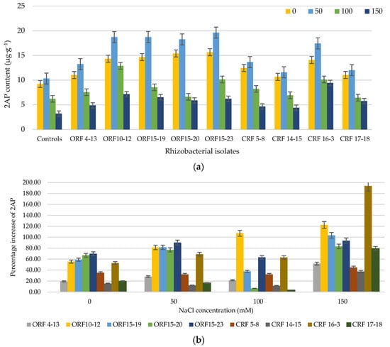 Interestingly, under salinity stress, inoculation of the PGPR isolates also significantly increased the 2AP content in rice leaves in the range of 3.5–193.7% (4.41–19.61 µg·kg−1) as compared to each respective control. Among all the tested strains, the maximum 2AP content was observed upon inoculation of Sinomonas sp. ORF15-23 at 50 mM NaCl (19.6 µg·kg−1) with an increase of 90.20% as compared to control-50 (10.3 µg·kg−1) and Burkholderia sp. CRF16-3 at 150 mM NaCl (9.4 µg·kg−1) with a 193.7% increase as compared to control-150 (3.2 µg·kg−1). The 2AP content of all treatments increased with the increase in NaCl concentration up to 50 mM; however, beyond 50 mM NaCl, (100 and 150 mM NaCl), the 2AP content decreased with the increase in NaCl concentration. At 100 and 150 mM NaCl, strains ORF10-12 and CRF16-3 gave the highest 2AP levels with values of 12.87 and 9.43 µg·kg−1, equivalent to 107.2% and 193.7% increases, as compared to control-100 and control-150, respectively (Figure 2a,b).