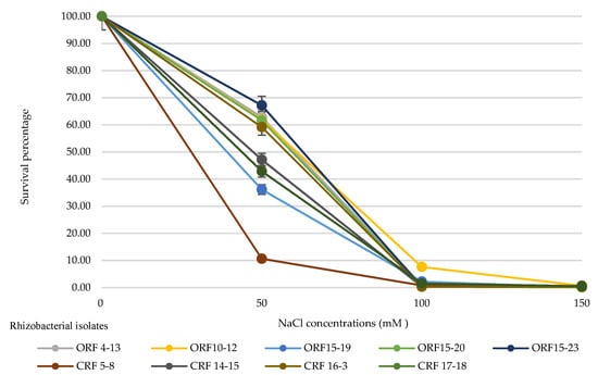 Survival of rhizobacterial isolates under different concentrations of NaCl in Hoagland’s solutions after 30 days of inoculation. The error bars represent the standard deviation of measurements for three replications.