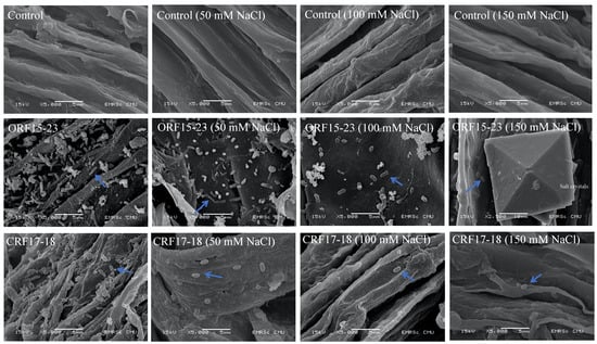 The potential of rice root colonization by the different rhizobacterial isolates was determined by scanning electron microscopy (SEM). The SEM images showed, as expected, no root colonization in the uninoculated controls seedlings at 0, 50, 100, and 150 mM NaCl (Figure 4). Dense root colonization by all nine tested rhizobacterial isolates was clearly observed in inoculated seedlings (data not shown). However, the colonization density declined with the increasing salinity level, and no colonization was observed at 150 mM NaCl except for the seedling roots inoculated with Sinomonas sp. isolate ORF15-23 and Bacillus sp. strain CRF17-18. In addition, the inoculated roots of both non-stressed and salinity-stressed seedlings were colonized by Sinomonas sp. strain ORF15-23 and Bacillus sp. Strain CRF17-18 (Figure 4).