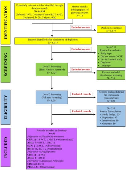 The following are available online at https://www.mdpi.com/article/10.3390/biology10101069/s1, Table S1: Full electronic search in MEDLINE database through 31 July 2020; Table S2: Key characteristics of included studies of filgrastim versus placebo/no treatment; Table S3: Key characteristics of included studies of filgrastim versus pegfilgrastim; Table S4: Key characteristics of included studies of filgrastim versus biosimilar filgrastim; Table S5: Baseline and clinical patients’ characteristics: (filgrastim vs. placebo controlled trial/no treatment); Table S6: Baseline and clinical patients’ characteristics (filgrastim vs. pegfilgrastim); Table S7: Baseline and clinical patients’ characteristics (filgrastim vs. biosimilar filgrastim); Table S8: Type of trial reported (filgrastim vs. placebo controlled trial/no treatment; Table S9: Type of trial reported (filgrastim vs. pegfilgrastim); Table S10: Type of trial reported (filgrastim vs. biosimilar filgrastim); Table S11: Key characteristics of studies that compared filgrastim with placebo or no treatment by indication and study type; Table S12: Key characteristics of studies that compared filgrastim with pegfilgrastim by indication and study type; Table S13: Key characteristics of studies that compared filgrastim with biosimilar filgrastim by indication and study type; Figure S1: Cochrane Collaboration Risk of Bias Assessment Tool version 2 (RoB 2); Figure S2: Funnel plots for filgrastim versus placebo/no treatment; Figure S3: Funnel plots for filgrastim versus pegfilgrastim.