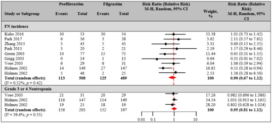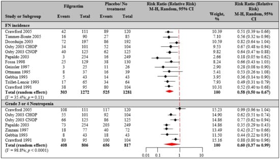 Random-effect meta-analysis was used to synthesize the results from direct (head-to-head) trials for FN, grade 3 to 4 neutropenia and bone pain in CIN to compare the results from trials for FIL versus PCT/NT and FIL versus PEG-F; relative risks (RR) were determined. Heterogeneity across studies was assessed, using forest plots. The inconsistency index (I2) was used to quantify the percentage of variability due to heterogeneity rather than sampling error.