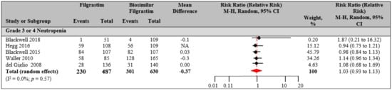 Our meta-analyses confirm and strengthen the previous evidence that PP with FIL in U.S. approved indications is effective in reducing chemotherapy-associated FN. In particular for CIN, the indication of the risk of febrile neutropenia in filgrastim versus placebo/no treatment was not statistically significant (RR 0.58, 95% CI 0.50 to 0.67). However, the rate of reducing grade 3 or 4 neutropenia in filgrastim was statistically significant when compared to placebo/no treatment (RR 0.60, 95% CI 0.37 to 0.99). Regarding secondary outcomes, hospitalization was 10 days in FIL patients, compared to 14 days in PCT/NT patients, and documented infection associated with several malignancies and treatment regimens was less with FIL versus PCT/NT. These findings are consistent with the previous observations [31,85]. A study by Lyman et al. [86] suggested a non-significant increase in OS in patients receiving FIL versus PCT/NT, but in our analysis and in the study by Dale et al. [31], none of the studies reported a difference in the survival rates of FIL versus placebo. Additionally, the follow-up time was not consistently reported among the studies.