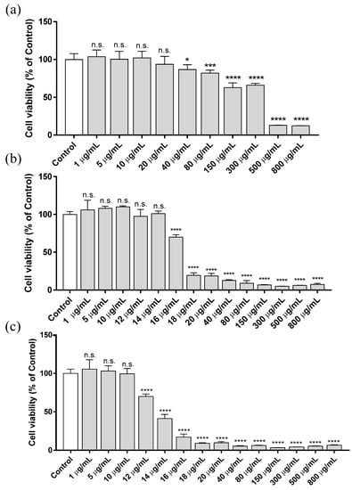 Cytotoxicity assay (MTT method) in human keratinocytes HaCaT cell line after exposing the cells for 3 h (a), 12 h (b) and 24 h (c) to several concentrations of ZnCl2, ranging from 1 to 800 µg/mL. Results represented are normalized to the control group (culture media without ZnCl2). Data depicted as mean ± SD of six replicates. Significant differences with respect to control were determined by one-way ANOVA with Tukey’s correction for multiple comparisons: * p > 0.05; *** p > 0.001; **** p > 0.0001; n.s. = not significant.