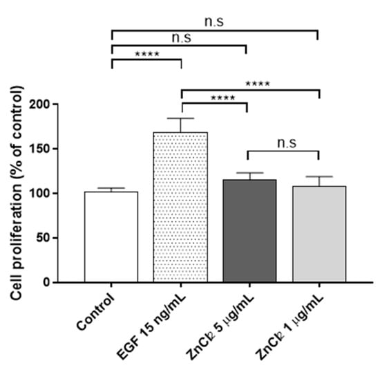 Proliferative activity of ZnCl2 after 72 h of exposure in human keratinocytes. Results represented are normalized to the control group (culture media without ZnCl2). Data depicted as mean ± SD of six replicates. Significant differences were determined by one-way ANOVA with Tukey’s correction for multiple comparisons: **** p > 0.0001; n.s. = not significant.
