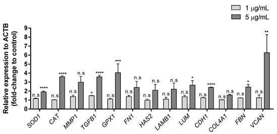 Effects of Zn2+ on HaCaT cell line after 24-h treatment. Expression of different genes at 1 and 5 µg/mL ZnCl2 concentration. Data depicted as mean ± SD of three replicates. Results represented as fold-change to control and relative expression to ACTB. Significant differences were determined by one-way ANOVA with Tukey’s correction for multiple comparisons: * p < 0.05; ** p < 0.01; *** p < 0.001; **** p > 0.0001; n.s. = not significant.