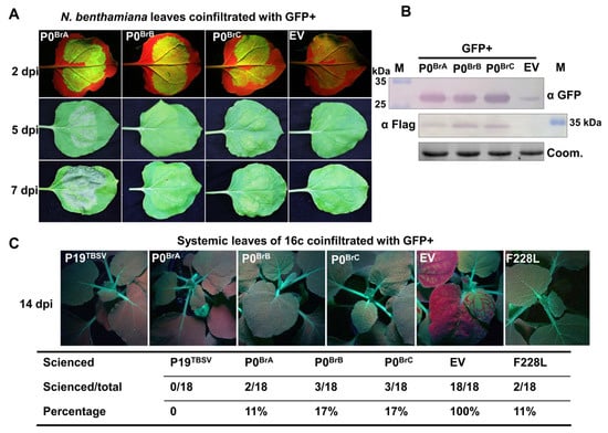 3.2. Both P0BrB and P0BrC Suppressed Local and Systemic RNA Silencing