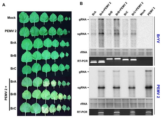 - Zhou, C.J.; Zhang, X.Y.; Liu, S.Y.; Wang, Y.; Li, D.W.; Yu, J.L.; Han, C.G. Synergistic infection of BrYV and PEMV 2 increases the accumulations of both BrYV and BrYV-derived siRNAs in Nicotiana benthamiana. Sci. Rep. 2017, 7, 45132. [Google Scholar] [CrossRef] [PubMed]