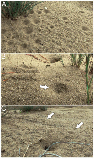 Ant rescue actions in the field might be observed in the context of capture by predatory antlion larvae. Aggregation of traps built by antlions in the habitat shared with sand-dwelling ants, such as F. cinerea (A). Traps of antlions (indicated by arrows) close to nest entrances of F. cinerea, with visible forager workers (B,C). The traps are 2–5 cm in diameter. Photographs: F. Turza, Błędowska Desert (southern Poland).