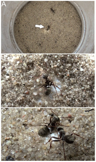 Experimental study of rescue behavior in ants began in 2009, with a paper by Nowbahari et al. [32]. The authors tested the hypothesis that kinship between the receiver of rescue and the giver of rescue determines rescue expression. The authors addressed this question by investigating the response of the sand-dwelling Cataglyphis cursor ants, in which they observed some rescue actions in the field, to endangered homocolonial (i.e., individuals of the same species from the same colony), heterocolonial (i.e., individuals of the same species from another colony) and heterospecific (i.e., individuals of another species) ants. For that purpose, they developed a laboratory “artificial nylon snare situation”—a simulation of an ant becoming entrapped by collapsing sand or debris that, in ants such as C. cursor, was a plausible ecological situation in which these ants might find themselves in need of rescue. In the simulation, the “victim” individual was tied using a nylon thread to a piece of paper and placed on an arena, where it was partially buried beneath the sand surface (Figure 2). By manipulating the “potential rescuers” introduced into the arena—five individuals from the same colony, from another colony or from another species—they were able to measure rescue activity under varying conditions of relatedness between the victim and the potential rescuers. The authors found that rescue actions occurred exclusively in the homocolonial condition. Rescue behavior was expressed as sand digging, sand transport, pulling at the legs of the victims and, remarkably, biting the nylon snares. That last behavioral category was not a response to a foreign object because nylon threads, when not used for entrapping homocolonial victims, were met with total indifference from the ants. Furthermore, because the authors included a control group of anesthetized victims (i.e., an additional test type with the victim in a chill coma and five homocolonial potential rescuers), they were able to conclude that rescue behavior releaser signals, in the form of some pheromones, were emitted only by active victims. This was because they observed no rescue attempts towards anesthetized victims.