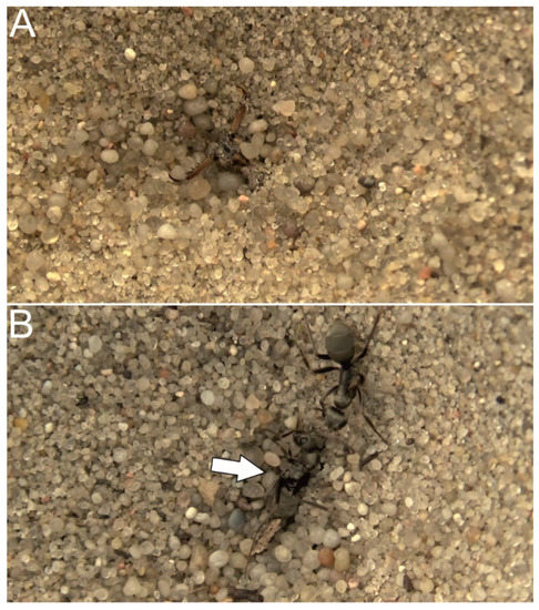 Only much later, in 2002, Czechowski et al. [27] provided observations of “rescue actions” in ants in another life-threatening situation—capture by predatory antlion larvae. Antlion larvae, many species of which inhabit sandy areas and build pitfall traps, hunt for small arthropods, mainly ants (Figure 1) [28]. The authors found that the sand-dwelling Formica sanguinea and F. cinerea ants, when caught by antlions, elicited vigorous “rescue behavior” in their respective nearby nestmates. The rescue behavior took the form of pulling at the captured individuals and digging in the sand surrounding them. In contrast, identical situations elicited no rescue behavior in another sand-dwelling ant species, F. fusca, when nestmates were captured. The authors, in light of the studies mentioned earlier [24,25,26] as well as some other studies, focused more on the identification of chemical substances that elicited alarm and digging behavior in various species of ants [29,30,31], discussed possible rescue behavior releaser signals in the studied species. These signals potentially included compounds present in mandibular, anal or venom gland secretions. Rescue behavior in ants in the context of capture by predatory antlions seemed truly risky and potentially costly.