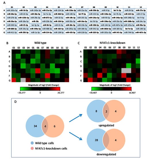Differential expression profiling of miRNAs in RAW264.7 cells. (A) Heat-map legend showing the mouse miRNAs Profiler PCR array with all miRNAs analyzed. (B) Heat-map profile showing the resulting PCR array dataset derived from the normalization of RANKL+ versus RANKL− cells (wild-type). (C) Heat-map profile showing the resulting PCR array dataset derived from the normalization of RANKL+ cells transfected with NFATc1 siRNA (NFATc1-knockdown) versus those transfected with negative control (NC) siRNA. Red squares, upregulated miRNAs; green squares, downregulated miRNAs; black squares, unchanged miRNAs; grey squares, technically unacceptable data. These latter were not considered in the analysis of our results. (D) PCR array data from the two treatments (wild-type and NFATc1-knockdown) were represented by Venn diagram.
