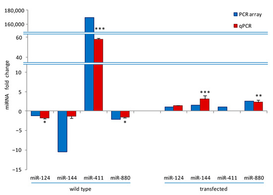 We next performed a validation of the PCR arrays data on a selection of miRNAs, namely, miR-124-3p, miR-144-3p, miR-411-5p, miR-880-3p, and miR-295-3p, by qPCR and compared the results obtained with PCR array data (Figure 2). Excluding miR-295-3p, whose expression could not be determined in any treatment, and miR411-5p, which was undetermined in NFATc1-depleted cells, the trend of qPCR data (red bars) is in good agreement with those of PCR array (blue bars), i.e., the up- or downregulation of the various miRNAs was confirmed, even if some values were below the established threshold (higher or lower than ±2). In particular, in wild-type cells, the order of magnitude for values of miR-144-3p and miR-411-5p expression was visibly different between the two analyses, although the trend was in the same direction. This is probably due to the diverse methods of analysis, in agreement with what was reported by Prokopec [32].
