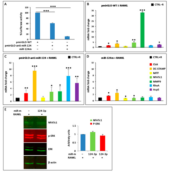 Furthermore, we evaluated the potential role of endogenous miR-124-3p during osteoclastogenesis by qPCR. First, RAW264.7 cells were transfected with pmiRGLO-WT and then stimulated with RANKL for 24 h to rule out any technical problems due to transfection with the empty vector (Figure 3B). RAW264.7 cells transfected with pmiRGLO-WT without RANKL (CTRL-R) served as control. As expected, the osteoclastogenesis started after RANKL stimulation since the expression levels of CtsK, DC-STAMP, NFATc1, MMP9, RhoA, and Acp5/TRAP increased significantly compared to pmiRGLO-WT transfected cells without RANKL (CTRL-R) (Figure 3B). A further increase in the expression levels of these genes was observed in cells transfected with pmiRGLO-anti-miR124 and stimulated with RANKL for 24 h, compared to the pmiRGLO-WT control with RANKL (CTRL + R) (Figure 3C), probably as a consequence of endogenous miR-124-3p subtraction. On the other hand, an excess of miR-124-3p obtained by transfecting cells with miR-124m (mimic) and treating them with RANKL for 24 h caused a significant decrease in the expression of NFATc1 and MITF compared to the negative control with RANKL (CTRL + R) (Figure 3D). Moreover, the expression of Acp5, MMP9, and RhoA did not change, while DC-STAMP and CtsK slightly increased compared to the control with RANKL (Figure 3D). The augmented endogenous levels of transfected miR-124-3p mimic were confirmed by qPCR (data not shown). Intriguingly, transfection with miR-124m did not change the levels of both NFATc1 and p-ERK1/2 proteins (Figure 3E).