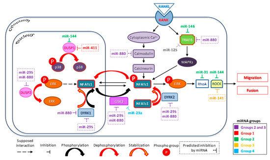The following are available online at https://www.mdpi.com/article/10.3390/biology10111080/s1, Table S1, Sequences of primers used in experiments. Figure S1, NFATc1 mRNA and protein expression in RAW264.7 cells transfected with negative control (NC)- and NFATc1-siRNAs, assessed by qPCR and Western blot, respectively. Table S2A, KEGG pathway analysis of group 1 miRNAs (10/10). Table S2B, KEGG pathway analysis of group 2 miRNAs (28/28). Table S2C, KEGG pathway analysis of group 3 miRNAs (6/6). Table S2D, KEGG pathway analysis of group 4 miRNAs (4/4). S1A, Group 1 miRNAs involved in selected pathways, showing the number of predicted target genes for each of them, as identified by Tarbase v.8 or MicroT-CDS v.5.0 databases. S1B, Group 2 miRNAs involved in selected pathways, showing the number of predicted target genes for each of them, as identified by Tarbase v.8 or MicroT-CDS v.5.0 databases. S1C, Group 3 miRNAs involved in selected pathways, showing the number of predicted target genes for each of them, as identified by Tarbase v.8 or MicroT-CDS v.5.0 databases. S1D, Group 4 miRNAs involved in selected pathways, showing the number of predicted target genes for each of them, as identified by Tarbase v.8 or MicroT-CDS v.5.0 databases. S2A, Lists of genes involved in MAPK pathway (mmu04010) as predicted targets of the Group 1 miRNAs. S2B, Lists of genes involved in MAPK pathway (mmu04010) as predicted targets of the Group 2 miRNAs. S2C, Lists of genes involved in MAPK pathway (mmu04010) as predicted targets of the Group 3 miRNAs. S2D, Lists of genes involved in MAPK pathway (mmu04010) as predicted targets of the Group 4 miRNAs. Table S3, List of the main genes involved in pathways regulated by the differentially expressed miRNAs highlighted in PCR arrays. S3A, Lists of genes involved in regulation of actin cytoskeleton (04810) as predicted targets of the Group 1 miRNAs. S3B, Lists of genes involved in regulation of actin cytoskeleton (04810) as predicted targets of the Group 2 miRNAs. S3C, Lists of genes involved in regulation of actin cytoskeleton (04810) as predicted targets of the Group 4 miRNAs. S4A, Lists of genes involved in ECM–receptor interaction (04512) as predicted targets of the Group 3 miRNAs. S5A, Lists of genes involved in focal adhesion (04510) as predicted targets of the Group 1 miRNAs. S5B, Lists of genes involved in focal adhesion (04510) as predicted targets of the Group 2 miRNAs. S5C, Lists of genes involved in focal adhesion (04510) as predicted targets of the Group 3 miRNAs. S5D, Lists of genes involved in focal adhesion (04510) as predicted targets of the Group 4 miRNAs. S6A, Lists of genes involved in osteoclast differentiation (04380) as predicted targets of the Group 1 miRNA. S6B, Lists of genes involved in osteoclast differentiation (04380) as predicted targets of the Group 2 miRNA. Figure S2, Western blot with two independent biological samples (1° and 2° experiments), detected with NFATc1, ERK1/2, p-ERK1/2 and β-actin antibodies.