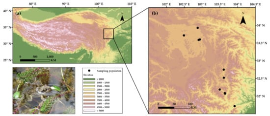 - Yu, T.L.; Jia, G.; Sun, H.Q.; Shi, W.H.; Li, X.L.; Wang, H.B.; Huang, M.R.; Ding, S.Y.; Chen, J.P.; Zhang, M. Altitudinal body size variation in Rana kukunoris: The effects of age and growth rate on the plateau brown frog from the eastern Tibetan Plateau. Ethol. Ecol. Evol. 2021, 1–13. [Google Scholar] [CrossRef]