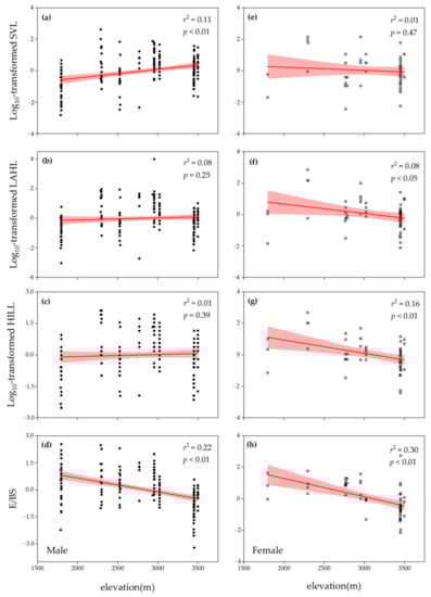 - Li, S.T.; Wu, X.; Li, D.Y.; Lou, S.L.; Mi, Z.P.; Liao, W.B. Body size variation of odorous frogs (Odorrana grahami) across altitudinal gradients. J. Herpetol. 2013, 23, 187–192. [Google Scholar]