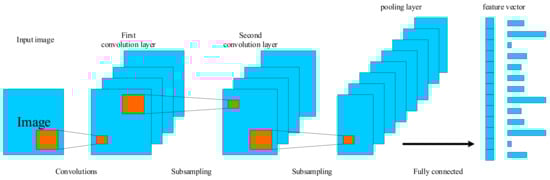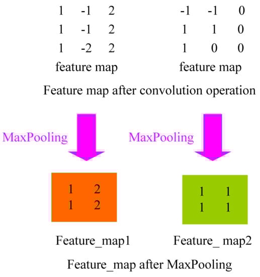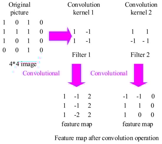 In a convolutional neural network, the convolutional layer plays a significant function, and the learning kernel is the focus of the layer’s parameter. The convolution kernel is modest in spatial dimension and dispersed throughout the entire input depth. The convolution layer is made up of a series of filters, which can be deemed a two-dimensional digital matrix [37]. The convolution kernel can be used to identify a typical feature of the image, filter each small area in the image, and get the eigenvalues of these small areas, as shown in Figure 7. When picture data enters a convolution layer, it convolves each filter across the input’s spatial dimension to form a 2D activation map. When sliding input, these activation maps can be viewed, and scalar products can be computed for each value in the core. The network will activate and learn the kernel from the input image when it searches for a specific feature in a given spatial position. Each kernel has an activation map that is layered to the depth dimension to produce the convolution layer’s whole output volume.