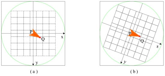 In Figure 4, P is the key point, and Q is the point of the selected region. Inside the circle is the region of picking points, and each small grid represents a pixel. The central area of the circle is regarded as a board, and the mass of each point on the board is equal to its corresponding pixel value. The same feature point should have sufficiently similar descriptors, which is called the reproducibility of descriptors. The descriptors obtained by the BRIEF algorithm do not have sufficiently similar descriptors with the same feature points in images with different sizes, directions, and shades, so descriptors have no robustness. The ORB does not address scale consistency, but BRIEF descriptors do not have rotation invariance. Figure 4a represents the selected point pairs, and Figure 4b represents the matching point pairs calculated with the coordinate system in the main direction by rotation of a certain Angle. Although rotation invariance is added to the improvement of BRIEF, at the same time the discriminability of feature descriptors is reduced. The most important characteristic of the ORB algorithm is its high calculating speed, which first benefits from using FAST detection characteristic points. Then, the BRIEF algorithm is used to compute the descriptor, whose unique representation of a binary string not only has space-saving storage but also minimizes the matching time.