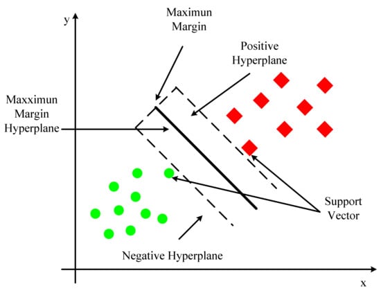 In conventional machine learning, the support vector machine (SVM) [28] is an important classification algorithm. As shown in Figure 5, the model assigns instances’ eigenvectors to specific locations in space. The goal of the SVM is to build a line that distinguishes between the two types of points so that the line can be used to classify additional points in the future. SVM is appropriate for nonlinear, high-dimensional classification problems with small and medium-sized data samples. SVM was nearly universally regarded as the most successful and best-performing machine learning algorithm prior to the emergence of deep learning. The dividing line in higher dimensional space similar to that in two-dimensional space is called a hyperplane. On the hyperplane, both sorts of sample points have a lot of points. These locations are known as support vectors because they play a role in defining the hyperplane’s segmentation.
