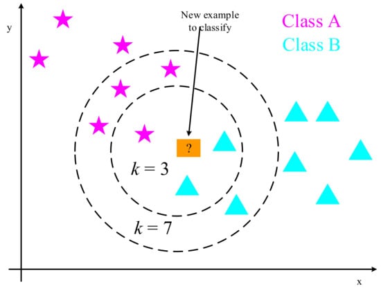 A simple classification and regression method is the k-nearest neighbors algorithm (kNN) [29,30,31]. As shown in Figure 6, it works by straightening a two-dimensional vector into a one-dimensional one and judging the similarity between the vectors based on the distance measure. To put it another way, given a training data set, the examples closest to a new input instance are located in the training data set. The input instance is classified into this class, as are the majority of these instances. This simple method without feature extraction loses the information of the most important adjacent pixels in the two-dimensional vector. Choosing the value of is one of the most important aspects of the k-nearest neighbors method. If a smaller value of is selected in the experiment, it means that the overall model will become complex. Some noises are learned into the model, whereas the real distribution of data is ignored, and overfitting can occur easily. Choosing a bigger value of in the experiment, on the other hand, is similar to making a prediction using training data from a broader neighborhood. In this circumstance, the training instance, which is located far from the input instance, will also play a part in the forecast, causing the prediction to be incorrect. When the value of is increased, the entire model becomes simpler. Oversimplified models tend to ignore a lot of helpful information in training data instances. When a smaller number is chosen, the cross-validation approach is commonly used to determine the best value, and a better result can be obtained based on experimental parameter tuning.