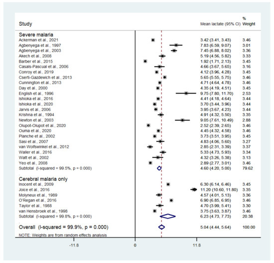 The primary outcome was the pooled mean blood lactate in patients with severe malaria. The secondary outcome was the pooled weighted mean difference (WMD) and 95% confidence interval (CI) of blood lactate between patients with severe malaria and those with uncomplicated malaria. The tertiary outcome was the pooled WMD and 95% CI of blood lactate, allowing a comparison between patients who died from and those who survived severe malaria.