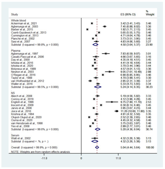 A subgroup analysis of the different types of blood samples (whole blood or plasma) showed that the pooled mean whole blood lactate level in patients with severe malaria was 4.5 mM (95% CI: 3.64–5.37, I2: 99.8%, n = 27,163 cases from seven studies), while the pooled mean plasma lactate level in patients with severe malaria was 5.24 mM (95% CI: 4.14–6.35, I2: 99.5%, n = 1177 cases from 11 studies) (Figure 3).