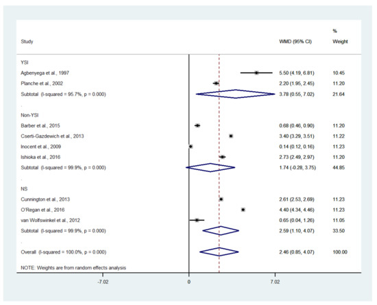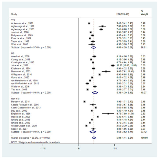 A subgroup analysis of the blood lactate level determined using an analyzer (YSI and non-YSI) showed that the pooled mean lactate level in patients with severe malaria according to a YSI analyzer was 4.88 mM (95% CI: 4.20–5.56, I2: 97.6%, n = 26,457 cases from eight studies), while the pooled mean lactate level in patients with severe malaria according to a non-YSI analyzer was 4.68 mM (95% CI: 3.62–5.74, I2: 99.7%, n = 1578 cases from 10 studies) (Figure 4).