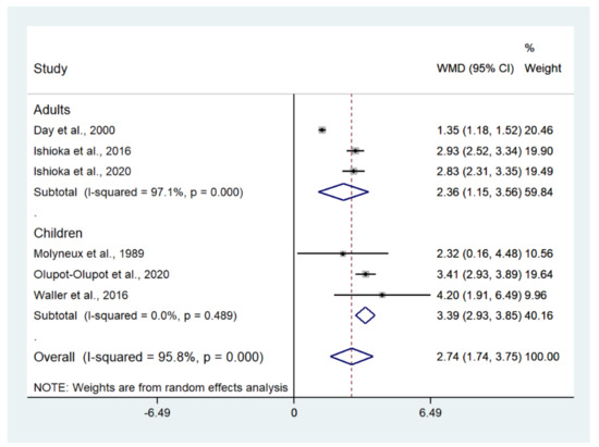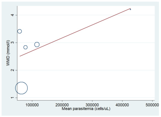 The difference in mean lactate level between patients with severe malaria who died and those who survived was estimated using the data available from six studies [10,20,21,41,44,51]. The results showed that the mean lactate level in patients with severe malaria who died (272 cases) was higher than in those with severe malaria who survived (1370 cases) (p < 0.001; MD: 2.74; 95% CI: 1.74–3.75; I2: 95.8%; six studies). A subgroup analysis of the participants showed that the mean lactate level in patients with severe malaria who died (162 cases) was higher than in those with severe malaria who survived (559 cases) in adults (p < 0.001; MD: 2.36; 95% CI: 1.15–3.56; I2: 97.1%; three studies) and children (p < 0.001; MD: 3.39; 95% CI: 2.93–3.85; I2: 95.8%; 110 deaths and 811 survivals; three studies) (Figure 10). The meta-regression analysis showed that the mean age, mean parasitemia, and proportion of males in the studies did not confound the MD of lactate between the two groups (p > 0.05). For the meta-analysis using mean age as a co-variate, the MD of lactate seemed to become continuously lower with increasing age (Figure 11). For the meta-analysis using mean parasitemia as a co-variate, the MD of lactate seemed to become continuously higher with increasing age (Figure 12).