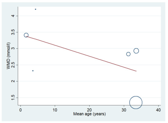 The difference in the mean lactate level between patients with severe and uncomplicated malaria was estimated using the data available from nine studies [17,18,19,20,35,37,43,46,50]. The results showed that the mean lactate level in patients with severe malaria (1568 cases) was higher than in those with uncomplicated malaria (1693 cases) (p = 0.003; MD: 2.46; 95% CI: 0.85–4.07; I2: 100%; nine studies). However, subgroup analyses showed that the mean lactate level in patients with severe malaria (1319 cases) was higher than in those with uncomplicated malaria (1515 cases) in children (p = 0.004; MD: 2.68; 95% CI: 0.84–4.52; I2: 100%; seven studies), while no difference in mean lactate was found between two groups of adults (p = 0.100; MD: 1.71; 95% CI: −0.33–3.75; I2: 97.4%; severe malaria: 249 cases; 178 cases of uncomplicated malaria; two studies) (Figure 6). A subgroup analysis of the different types of blood samples showed that the mean lactate level in patients with severe malaria (438 cases) was higher than in those with uncomplicated malaria (246 cases) in studies measuring plasma lactate (p < 0.001; MD: 3.25; 95% CI: 1.78–4.72; I2: 99%; four studies), while the mean lactate in patients with severe malaria (1085 cases) was higher than in those with uncomplicated malaria (1353 cases) in studies measuring whole-blood lactate (p < 0.001; MD: 2.23; 95% CI: 1.36–3.10; I2: 99.4%; four studies) (Figure 7). A subgroup analysis of the analyzers showed that the mean lactate level in patients with severe malaria (140 cases) was higher than in those with uncomplicated malaria (39 cases) according to the YSI analyzer (p = 0.022; MD: 3.78; 95% CI: 0.55–7.02; I2: 95.7%; two studies), while the mean lactate level in patients with severe malaria (1141 cases) was higher than in those with uncomplicated malaria (1317 cases) according to the non-YSI analyzers (p = 0.091; MD: 1.74; 95% CI: −0.28–3.75; I2: 99.9%; two studies) (Figure 8). A meta-regression analysis showed that the mean age, mean parasitemia, and proportion of males in the studies did not confound the MD of the lactate between two groups (p > 0.05). For the meta-analysis using mean age as a co-variate, the MD of lactate seemed to become continuously lower with increasing age (Figure 9).
