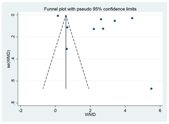 The funnel plot demonstrated an asymmetrical distribution of the estimates (blue dot) from the middle line. Abbreviations: se, standard error; WMD, weighted mean difference.