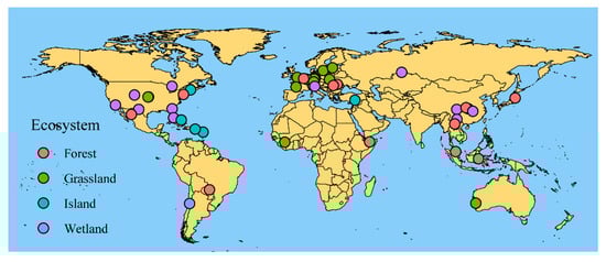 Geographic locations of the 39 studies included in the meta-analysis. Different colors indicate different ecosystem types.