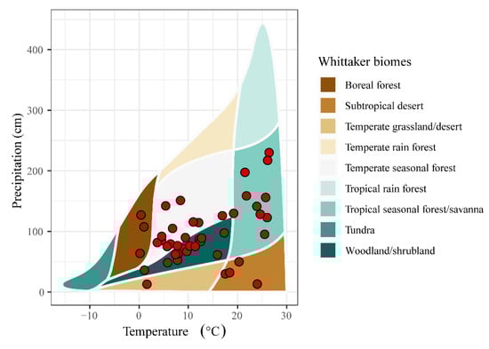 Environmental locations of the 39 studies across Whittaker’s biomes.
