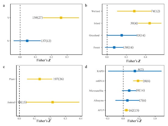 Cumulative effect sizes among different groups. The numbers of observations and studies are shown outside and inside the parentheses, respectively. (a) Y denotes discrete sampling and N denotes continuous sampling. (b) Cumulative effect sizes among different ecosystem types. (c) Cumulative effect sizes using different species. (d) Cumulative effect sizes using different molecular markers. Blue and yellow quadrates represent variables with 95% confidence intervals that do not overlap zero (p < 0.05), and overlap zero (p > 0.05), respectively.
