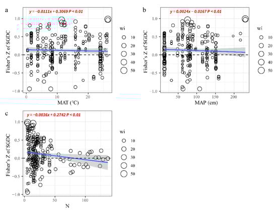 Effects of continuous variables on SGDC. (a) MAT: mean annual temperature, (b) MAP: mean annual precipitation, (c) N: number of sampling units. Partial linear regressions were used to fit the blue lines and the 95% CIs are presented as shaded areas. The significance (p-value) is shown for the tested relationship. The sizes of the circles represent the weights of the observations.