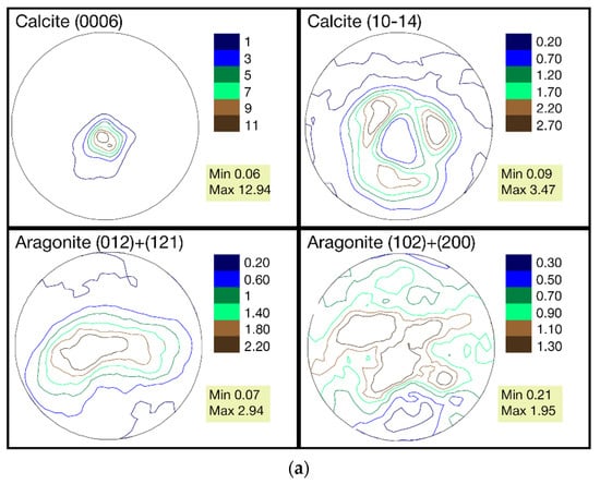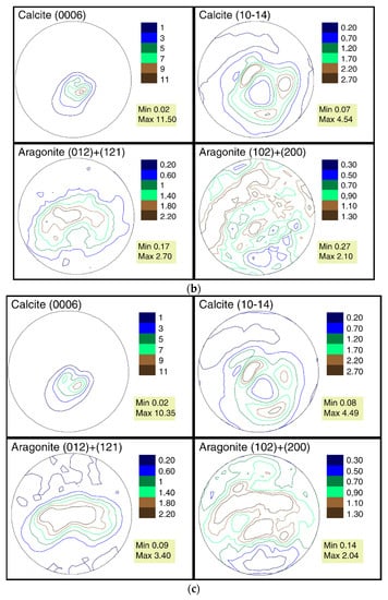 The pole figures of the calcite and aragonite phases for samples collected from the three stations are presented in Figure 3a–c.