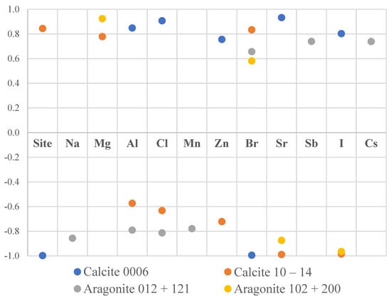 - Aragonite (102) + (200) correlated with Mg (r > 0.9, p < 0.001) and inversely correlated with Sr, I (r < −0.8, p < 0.002).