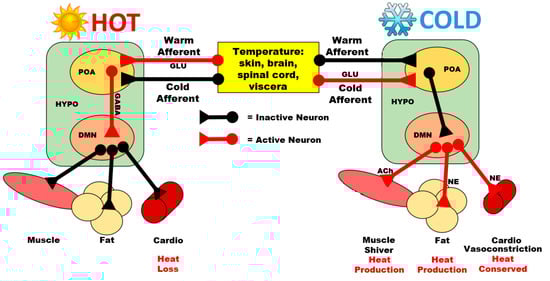 Simplified representation of the mammalian thermoregulatory system. Temperature receptors in various regions relay information to the preoptic area (POA) of the hypothalamus through the release of glutamate (GLU) from warm or cold afferents. For high temperature, the POA inhibits the dorsomedial nucleus of the hypothalamus (DMN) through gamma-aminobutyric acid (GABA) release. This results in the inactivation of circuits to the muscle, fat, and cardiovascular system, thereby reducing heat producing activities and increasing heat loss. For cooler temperatures, POA inhibition of the DMN decreases, which causes increased outflow from the DMN to peripheral targets, resulting in shivering through skeletal muscles, mediated by acetylcholine (ACh) release, increased heat production from fat metabolism due to increased norepinephrine (NE) release, and vasoconstriction to conserve heat. Adapted from [56].