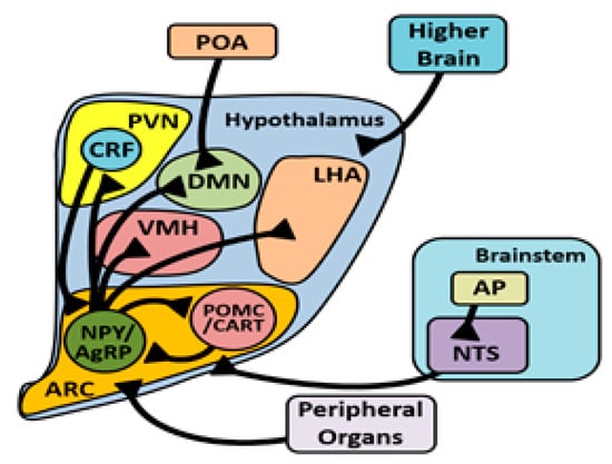Based on mammalian models, there are projections of NPY neurons from the ARC to other appetite-associated hypothalamic nuclei, reciprocal innervation between NPY and POMC neurons in the ARC, and reciprocal innervation between NPY and CRF in the ARC and PVN, respectively. Peripheral signals influence feed intake by affecting the ARC. Several other inputs from higher brain centers and the brainstem also converge on the hypothalamus and affect appetite. Additionally, temperature-related information from the POA converges on the hypothalamus, although how this connection affects feed intake is unclear. Adapted from [64,65,66].