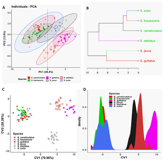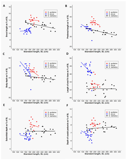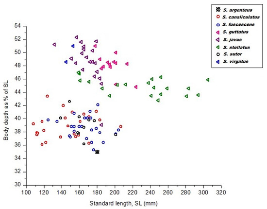 Furthermore, we employed PCA to determine which morphometric traits were most efficient at discriminating the three deep-bodied species (Figure 3). As reported earlier, the multivariate spaces of the three deep-bodied species were clearly different (Figure 3). PC1 (38.9% variability) and their differentiation was dominated by predorsal length (PDL) and body depth (BD), whereas PC2 (23.2% variability) was largely influenced by the snout length (SnL), depth of caudal peduncle, suborbital depth, and length of anal fin base (Figure 3). The three slender-bodied species (S. canaliculatus, S. fuscescens, and S. sutor) could not be distinguished based on any of morphological trait parameters, whereas deep-bodied species were distinguished successfully using the same six morphometric characters (Figure 4). Further classification was performed between individuals of the three deep-bodied species based on discriminant analysis applying a stepwise method and a Kruskal–Wallis test (p < 0.05). Results of pairwise comparisons between species are summarized in Figure S2. Our results show that snout length is the best parameter for discriminating among the three deep-bodied species (S. stellatus, S. guttatus, and S. javus) (Figure S2 and Table 1). Based on Table 1, S. javus (p = 0.683) displayed the lowest value for snout length as a percentage of standard length (9.8% to 11.7%) (SL: 130–185 mm), S. stellatus (p = 0.002) was 10.6% to 13.8% (SL: 155–310 mm) and S. guttatus (p = 0.604) was 12.5% to 15.5% (SL: 175–225 mm). Due to the presence of overlapping snout lengths, S. guttatus could be differentiated from S. stellatus and S. javus based on predorsal length (Figure 4B).