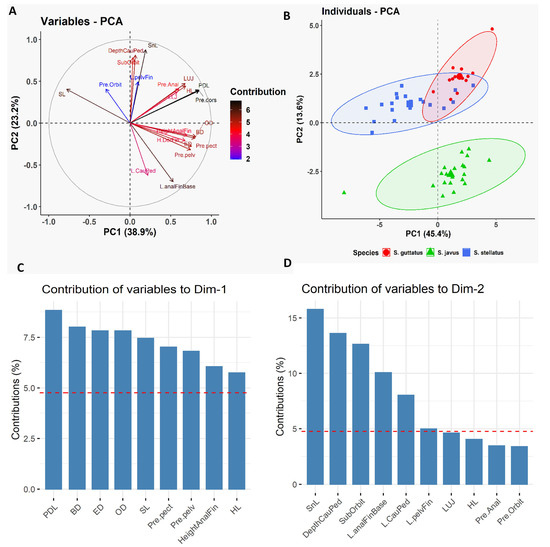 Principal Component Analysis (PCA) of morphometric data of three deep-bodied siganid species [S. guttatus (n = 14), S. javus (n = 20) and S. stellatus (n = 20)] collected from the South China Sea, Terengganu, Malaysia. (A) Biplot of the variable PCA is shown based on the morphometric data of three deep-bodied siganid species. (B) Biplot of the individual PCA is shown based on the morphometric data of three deep-bodied siganid species. (C) Relative contribution of morphometric variables to Dim-1 to discriminate three deep-bodied siganid species. (D) Relative contribution of morphometric variables to Dim-2 to discriminate three deep-bodied siganid species.