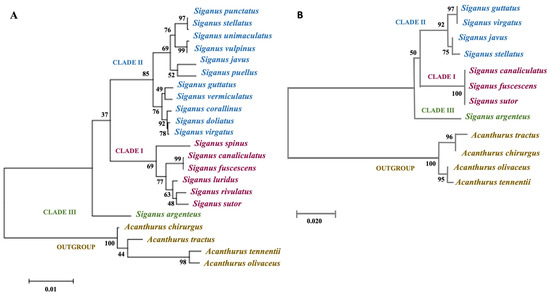 Maximum likelihood (ML) phylogenetic analyses of siganid taxa based on COI and RHO gene sequences. (A) ML phylogenetic relationship between 18 siganid taxa based on mitochondrial COI gene sequences, and (B) ML phylogenetic relationship between 8 siganid taxa based on RHO gene sequences. Bootstrap values are shown next to the branches, and the scale bar indicates the estimated number of substitutions per site. Clade I: slender-bodied, Clade II: deep-bodied, Clade III: moderately slender-bodied.