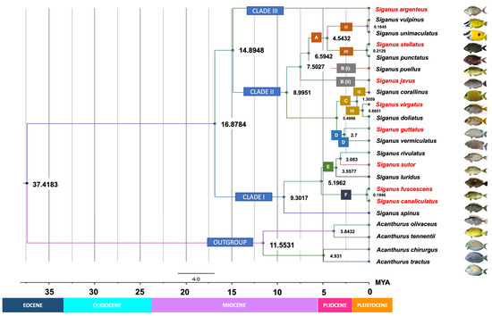 Our time-calibrated tree (Figure 6) suggests that siganids diverged from their sister lineage, the acanthurids, approximately 37.4 mya during the late-Eocene and then underwent further diversification during the mid-Miocene to early Pleistocene. Overall, the phylogenetic pattern generated here is consistent with the divergence times estimated for siganids by Siqueira et al. [12,13] based on cytochrome b, 16S ribosomal RNA, and ITS1 gene fragments, except for the positioning of S. argenteus. Any minor differences in timing can be explained by use of different markers in our study (COI and RHO gene) from those used previously (cytochrome b, 16S ribosomal RNA and ITS1 genes) [53]. Timing of the origin of siganids coincided with the rapid proliferation of complex perciform lineages that constitute all modern reef fish during the Eocene [54,55,56]. Emergence of siganids with other reef-associated species, including surgeonfish, butterflyfish, and labrids [40,57,58], has been linked to the evolution and expansion of extensive tropical shallow-water reef environments that resulted from greenhouse impacts on climate across the Paleocene–Eocene thermal maximum. This process caused substantial increases in sea-surface temperatures and raised sea levels at low latitudes. In addition, cooling temperatures at the southern poles at approximately 37 mya may have influenced the biogeography of many reef fish species and prompted the adaptive radiation of siganids toward northeastern biogeographical regions where they are found today [55,59,60].