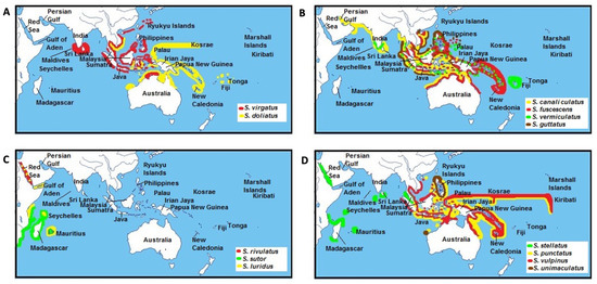 Distribution ranges of siganid sister species across the Indo-Pacific region adapted from Woodland [1]. Distribution regions for (A) S. virgatus and S.doliatus, (B) S. canaliculatus, S. fuscescens, S. vermicualtus, and S. guttatus, (C) S. rivulatus, S. sutor, and S. luridus, (D) S. stellatus, S. punctatus, S. vulpinus, and S. unimaculatus.